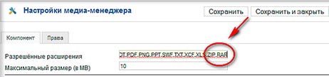 Далее, прежде чем создать новое вложение, вам нужно будет добавить файлы с нужным расширением в список разрешённых расширений. Для того, чтобы можно было загружать на сайт архивы, пройдите по адресу: Панель Управления - "Материалы" - "Медиа менеджер" – "Настройки" и добавьте расширения ZIP и RAR в список разрешённых расширений.