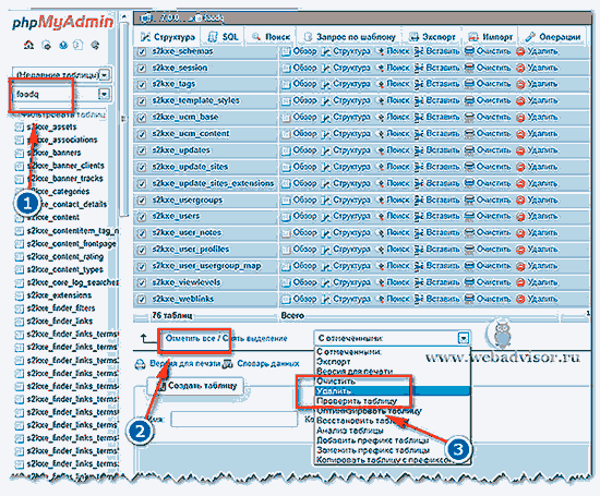 Чтобы удалить таблицы, войдите на главную страницу phpMyAdmin и выполните следующие действия: